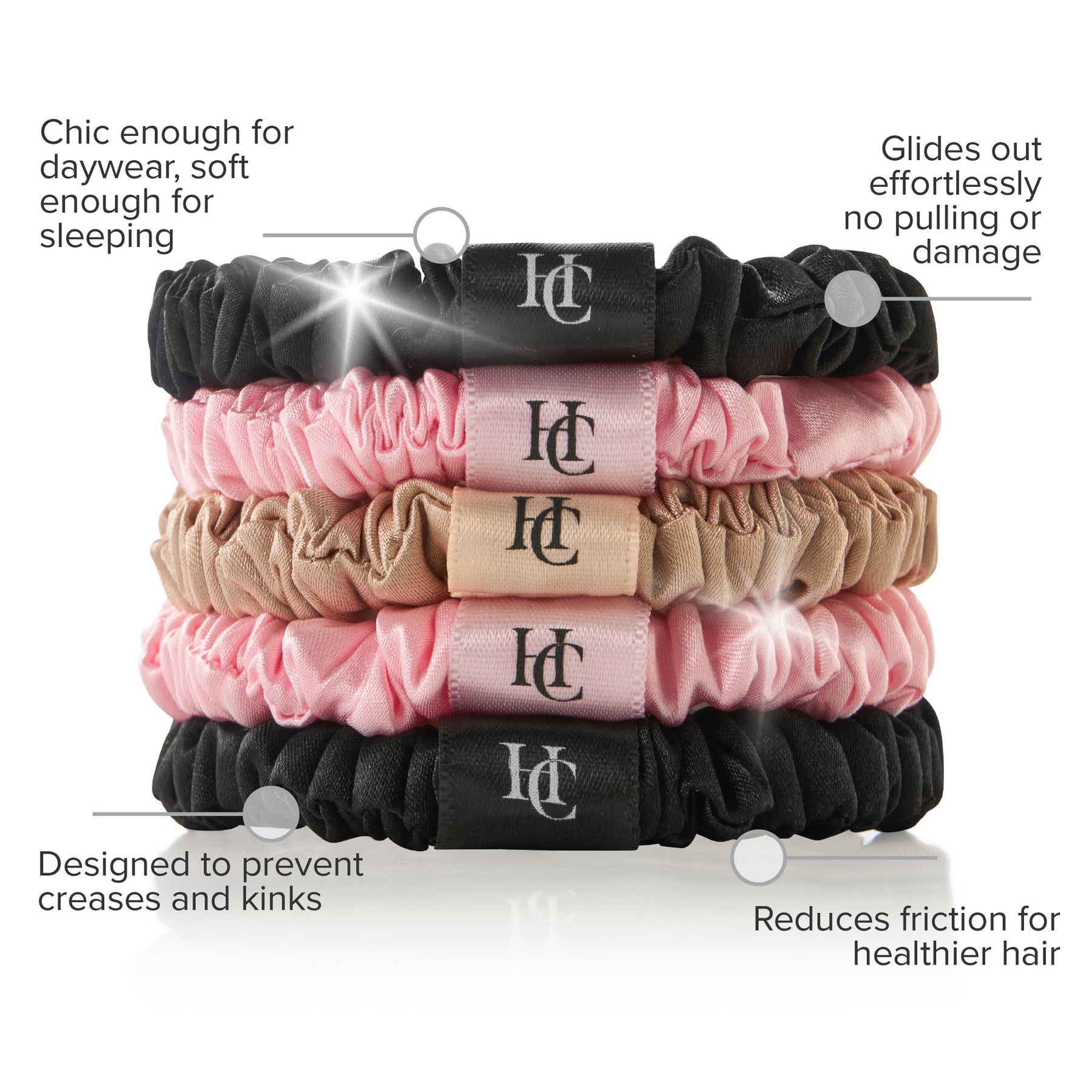 Elevate your hair care routine with these refined silk satin scrunchies, where elegance meets functionality. The sophisticated non-slip design maintains your style with effortless grace throughout your day—from boardroom to studio to bedroom. Distinguished by their luxurious silk satin composition, these scrunchies preserve your hair's natural moisture balance, effectively minimising breakage, frizz, and the unsightly creasing caused by conventional elastics. Thoughtfully engineered to accommodate thick hair and extensions with assured grip and stability, they deliver the polished results you'd expect from a professional salon. Presented in a curated collection of five pieces: timeless black, warm gold, and blush pink.